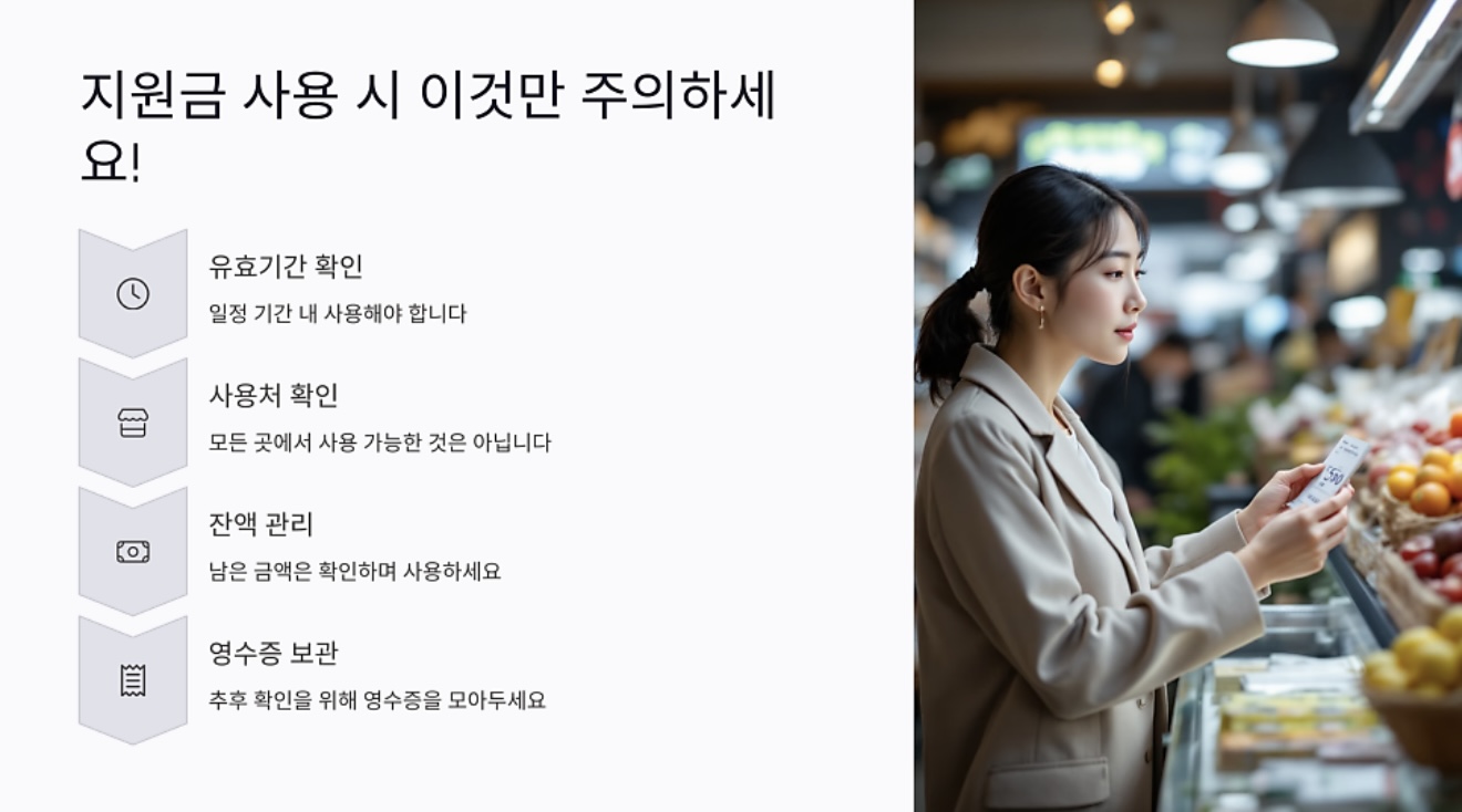 º 사용기한: 지급된 금액은 3~6개월 안에 사용해야 합니다. 기간 내에 사용하지 않으면 소멸되거나 회수될 수 있다 고 하니, 받게 되면 바로 필요한 곳에 쓰는 게 좋겠습니다